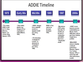 The document discusses the ADDIE model of instructional design, which consists of 5 phases - Analysis, Design, Development, Implementation, and Evaluation. It describes each phase in detail. The Analysis phase involves identifying learning objectives, audience needs, and constraints. The Design phase develops instructional strategies and prototypes. In the Development phase, learning materials are created. The Implementation phase delivers the instruction. Formative and summative evaluations are conducted in the Evaluation phase to assess effectiveness and identify improvements. The ADDIE model provides a systematic approach to instructional design but can be improved by addressing weaknesses such as unrealistic upfront analysis and lack of accommodation for changes.