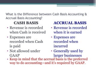 This document discusses the differences between cash basis and accrual basis accounting. Cash basis accounting records revenue when cash is received and expenses when cash is paid, while accrual basis accounting records revenue when it is earned and expenses when they are incurred. Accrual basis accounting is required under GAAP and is generally used by larger businesses. The document also discusses key accrual accounting concepts like recording accruals, the accounting period, when to record revenue and expenses, and preparing adjusting entries and an adjusted trial balance.