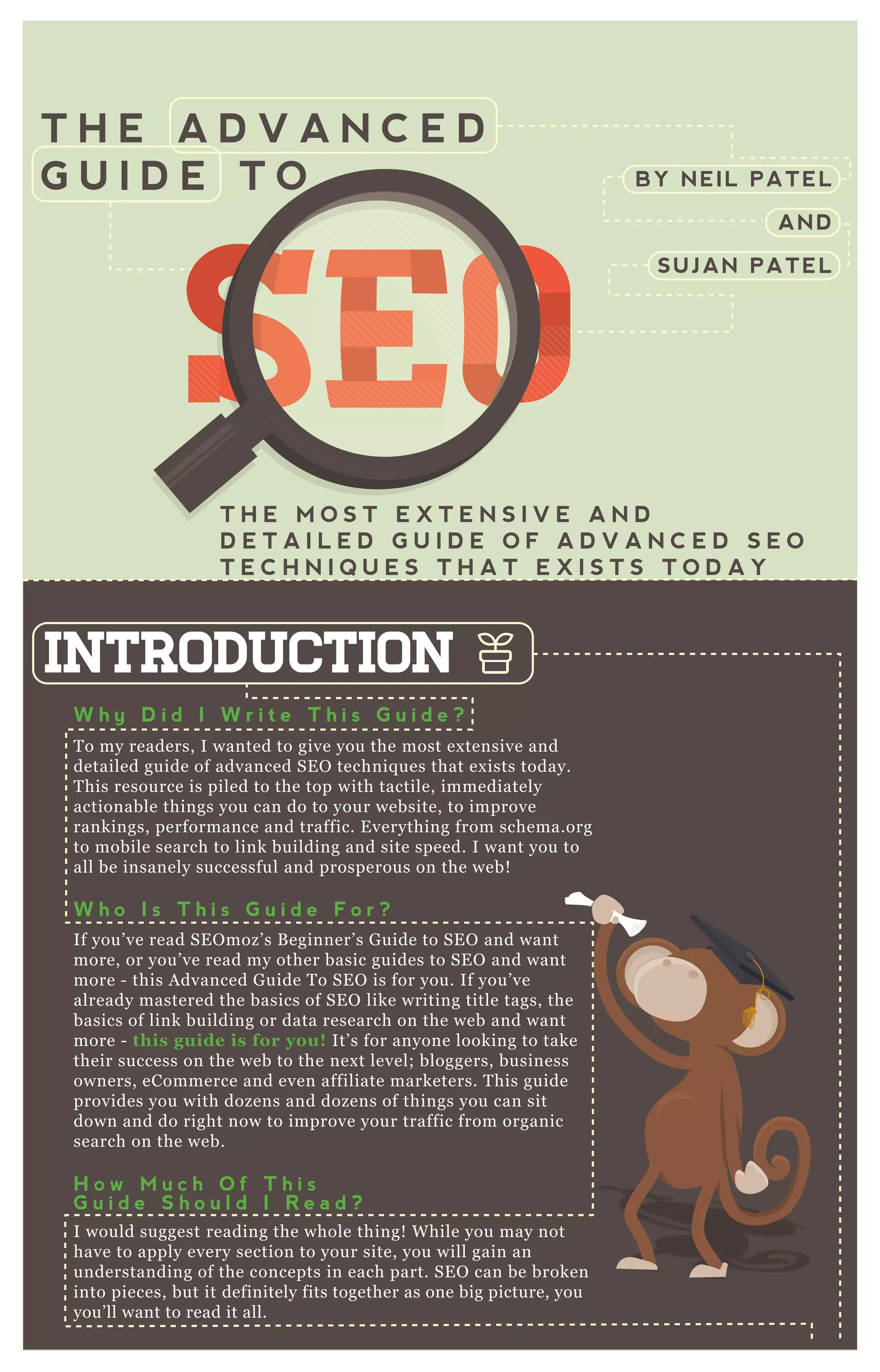 This document is an extensive guide on advanced SEO techniques aimed at improving website rankings, performance, and traffic for intermediate to advanced users. It covers various topics such as indexation, site speed, WordPress SEO, link building, and keyword research, providing actionable strategies and tools to enhance search engine visibility. The guide encourages readers to take proactive steps in optimizing their websites for both search engines and users.