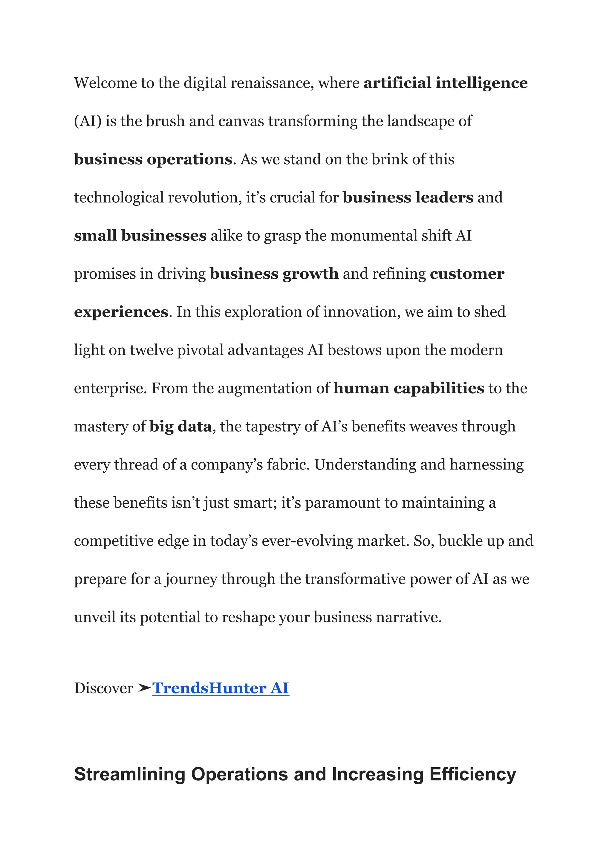 The document details twelve key benefits of artificial intelligence (AI) for businesses, emphasizing its role in enhancing efficiency, reducing costs, and personalizing customer experiences. It discusses the transformative power of AI in areas such as operations, marketing, risk management, and customer service, portraying it as essential for maintaining competitive advantage in today's market. The conclusion encourages businesses to adopt AI as a necessity for future growth and operational excellence.