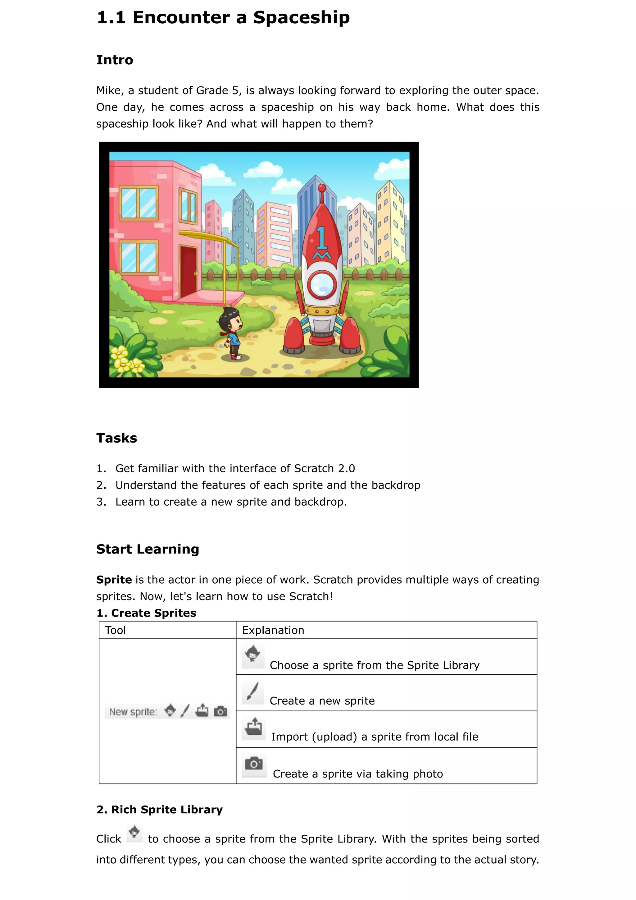 The document outlines an educational Scratch programming curriculum featuring a character, Mike, who encounters a spaceship and learns to create sprites, control animations, and interact with objects through coding. It covers various programming tasks such as importing images, adjusting coordinates, creating conversations between sprites, and enabling controls via keyboard and mouse. The curriculum is structured through self-assessment and homework tasks that encourage engagement with the programming concepts taught.