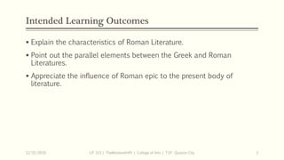 The document provides an overview of Roman literature and Virgil's epic poem The Aeneid. It discusses the origins and characteristics of Roman literature, influential Roman authors like Virgil, Horace and Ovid, and their major works. It then summarizes the background and main characters of The Aeneid, and provides a high-level synopsis of the events that occur in each of the poem's 12 books, including Aeneas's journey from Troy to Italy and his founding of Roman civilization.