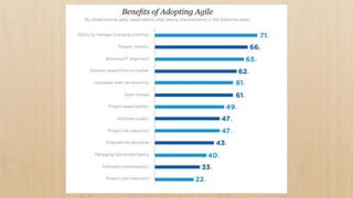 The document discusses the Agile mindset and methodology. It emphasizes delivering value through working software over comprehensive documentation, prioritizing individuals and interactions over processes, and responding to change over following a strict plan. A key principle is to identify assumptions and test them early through minimum viable products in order to gain feedback, reduce risks, and maximize learning.