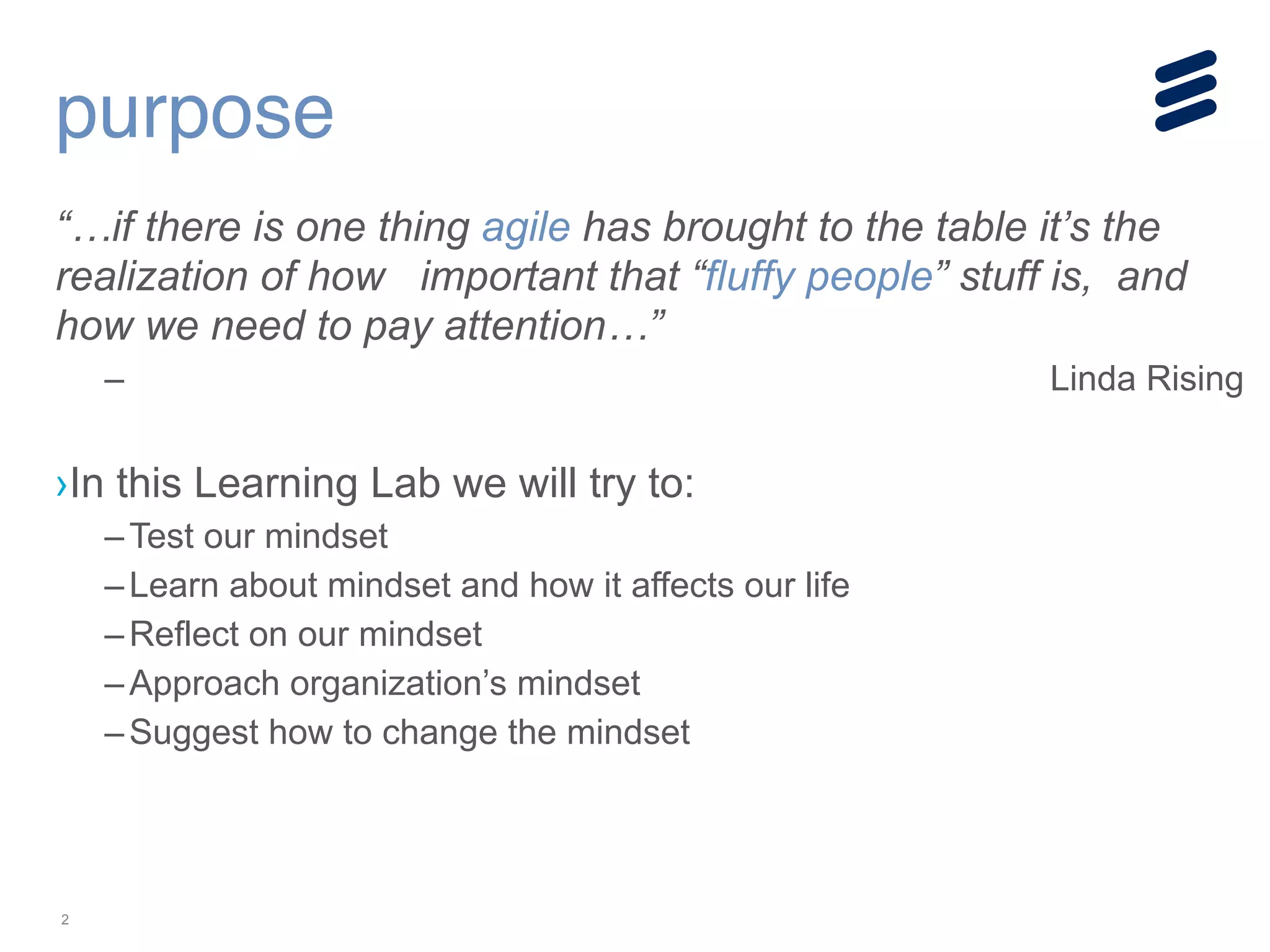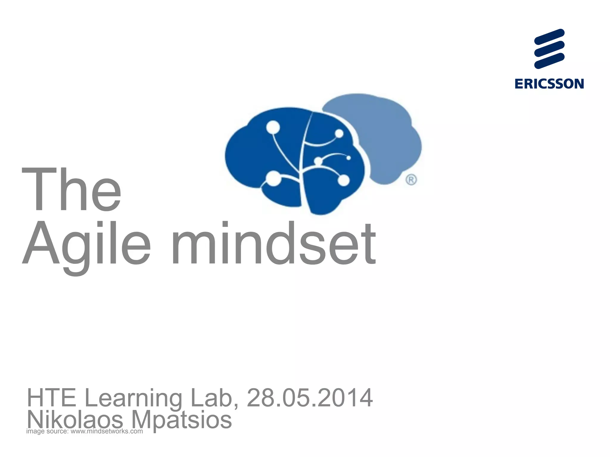 The document discusses different mindsets and how they affect our lives and work. It describes a fixed mindset where people believe their abilities are set and can't change, versus a growth mindset where people believe their abilities can develop over time through effort. Having a growth mindset creates resilience and a love of learning. The document suggests that organizations also have mindsets and can be either fixed or growth oriented. It provides tips on assessing your own and your organization's mindset and how to cultivate a growth mindset.