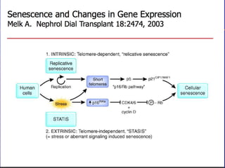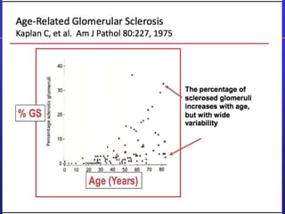 This document discusses aging and the aging kidney. It begins by outlining the epidemiology and theories of aging, including how aging is a cumulative process influenced by both genetic and environmental factors. It then examines age-related changes in the kidney, including morphological changes like glomerulosclerosis, interstitial fibrosis, and vascular sclerosis. These changes are thought to be caused by factors like telomere shortening, oxidative stress, inflammation, and accumulation of advanced glycation end products over time. Managing these age-related changes and underlying disease processes is an important part of caring for the growing elderly population.