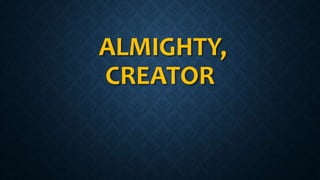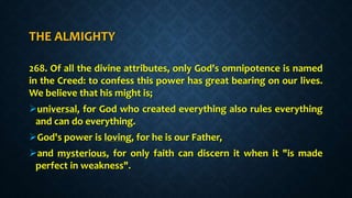 God's power is described as universal, loving, and mysterious. The document discusses how God created and rules over the universe and all things are possible with Him. It is said that God reveals His power through His fatherly adoption of humanity and conquering of evil through Christ's resurrection. True faith acknowledges God's almighty power, even when He seems powerless, and looks to Christ and the Virgin Mary as examples of believing in God's ability to do great things.