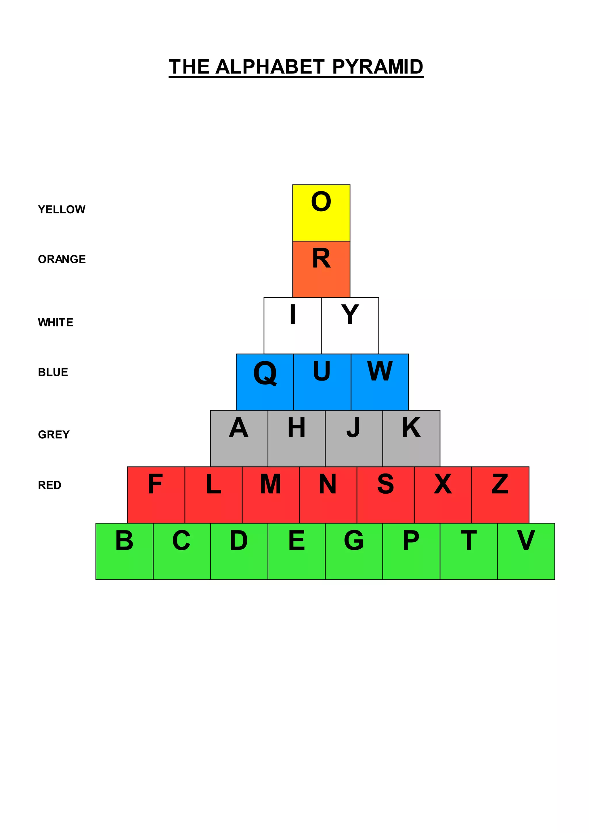 The document describes a pyramid structure with letters of the alphabet arranged from top to bottom. Yellow letters are at the top, followed by orange, white, blue, and grey in descending order, with red letters at the very bottom. Individual letters are also arranged within the levels from left to right.
