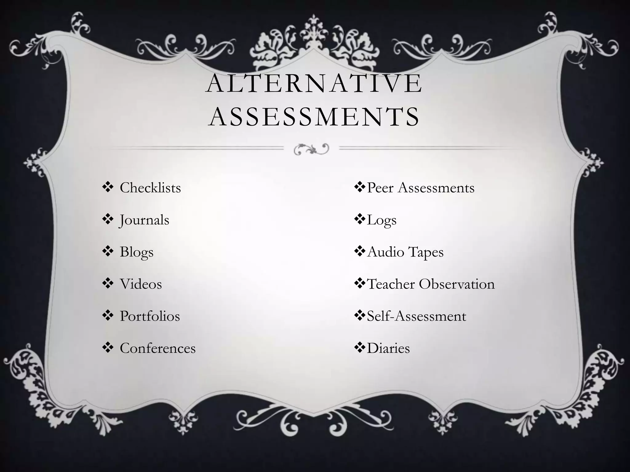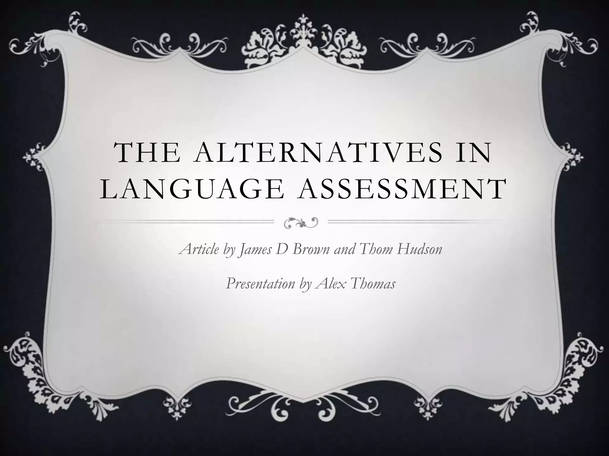 Alternative assessments include things like checklists, journals, blogs, videos, portfolios, conferences and self-assessments. They require higher-level thinking and real-world contexts. There are three basic types of assessments: selected response, constructed response, and personal response. Each has strengths and weaknesses for measuring language skills. The presenter emphasizes using different assessments wisely and providing students with feedback.