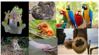 Tropical rainforests are located in warm, equatorial regions like South America, receiving high average rainfall of 108 inches per year. They have immense biodiversity, being home to over 427 mammal, 1,300 bird, and 400 amphibian species. The document describes some animal species found in rainforests like anacondas, glass frogs, macaws, sloths, and jaguars. It also discusses plant species like corpse flowers, strangler figs, and Amazon water lilies. Food webs and pyramids in rainforests are explained, showing energy transfer between primary producers, primary consumers, and apex predators. Photosynthesis occurs most actively in the canopy layer. Deforestation is an issue