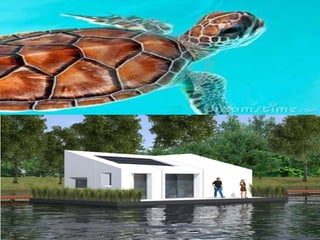 The document discusses the design and environmental benefits of an amphibious structure using expanded polystyrene (EPS) as a key material, which provides buoyancy and flood resistance. It highlights EPS's properties, applications in construction, and its minimal environmental impact, such as low thermal conductivity and reduced waste. The proposed floating homes aim to create sustainable, economical housing solutions that adapt to water level changes while ensuring safety during floods.