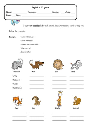 1) The document contains an English lesson for 5th grade with various exercises about animals, including writing riddles, choosing the correct words to complete sentences, matching animals to their sounds and homes, and filling in missing words in passages.