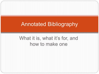 This document provides instructions on how to create an annotated bibliography. It defines an annotated bibliography as a list of citations followed by brief descriptive and evaluative paragraphs (annotations) that describe the relevance and quality of each source. The annotations typically evaluate the author's authority, intended audience, main points, and how the source illuminates the research topic. The document outlines the process of researching sources, writing citations, and composing 150-word annotations with four key elements: authority, audience, main points, and relevance. It provides formatting guidelines and an example of a properly formatted annotated bibliography entry.
