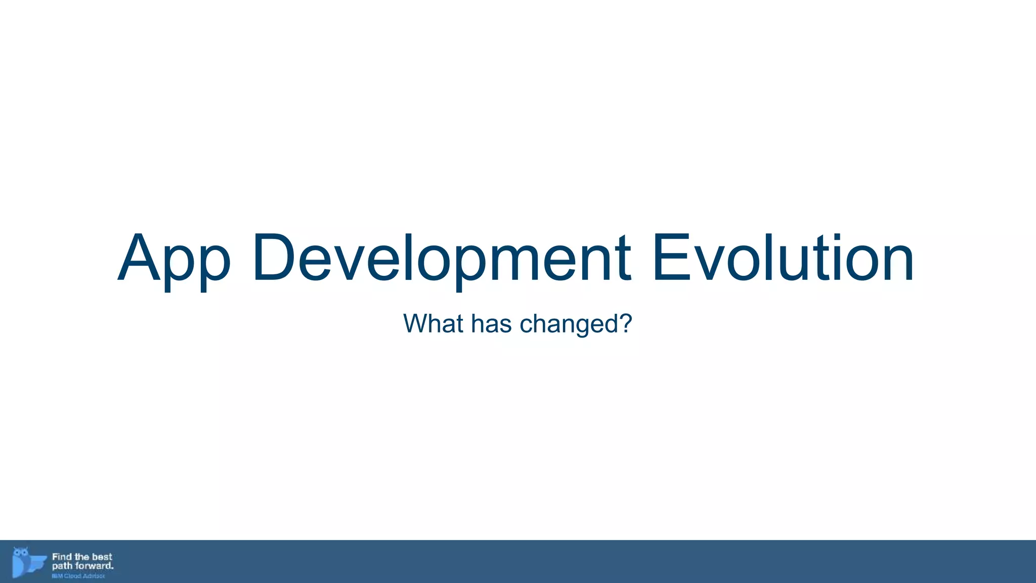 The document discusses the evolution of application development, emphasizing the shift to cloud-centric models including cloud native and microservices architectures. It outlines coding practices, tools, and frameworks that improve development agility, resilience, and scalability, highlighting the importance of APIs in microservices. The document also touches upon hybrid cloud solutions and automation technologies that enhance the deployment and management of applications in cloud environments.