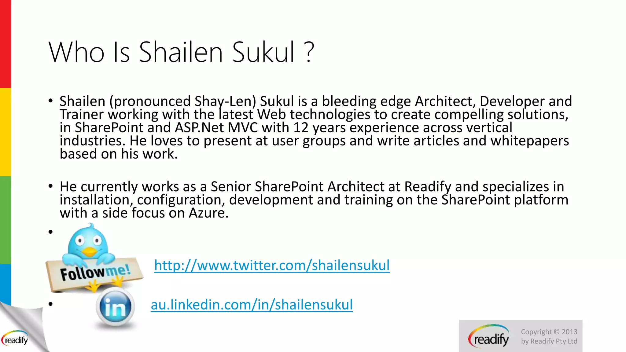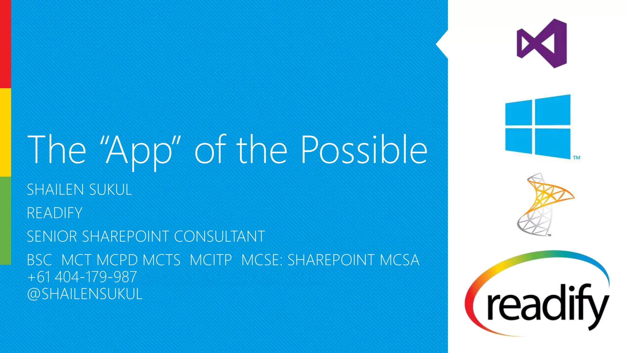 Shailen Sukul is a senior SharePoint architect with over 12 years of experience, specializing in the development and training of SharePoint apps using modern web technologies. The document outlines the nature of SharePoint apps, their benefits, and reasons for Microsoft's shift towards this app-based model, emphasizing the ease of installation and management. It concludes with an overview of the SharePoint app store, a marketplace for obtaining these applications.