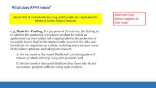 The document discusses the Appropriate for the Protection of Public Health (APPH) standard as outlined in Section 910 of the Federal Food, Drug, and Cosmetic Act, focusing on the evaluation of new tobacco products based on the risks and benefits to the overall population. It highlights various challenges and considerations related to the assessment of tobacco products, including the impact on youth vaping and adult smoking cessation, and suggests potential solutions for addressing individual and population risks. There is an emphasis on the need for comprehensive market surveillance and post-market monitoring to manage unintended consequences of product regulation.