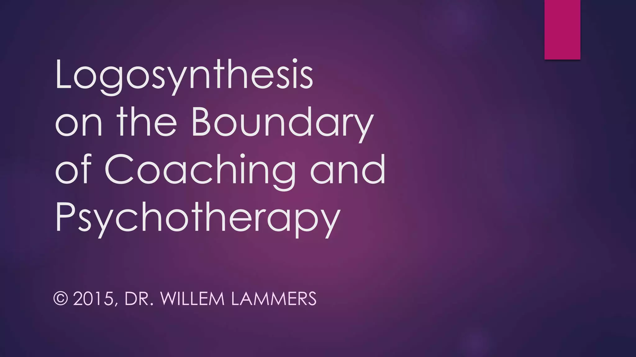 The document discusses the distinctions between psychotherapy and coaching, highlighting that psychotherapy addresses mental health issues, while coaching focuses on maximizing personal and professional potential. It provides guidelines for coaches using logosynthesis to avoid boundary issues, including staying close to the client, focusing on present issues, and using the client's language and imagery. The author, Dr. Willem Lammers, emphasizes an energetic framework that supports effective practice in coaching and psychotherapy.