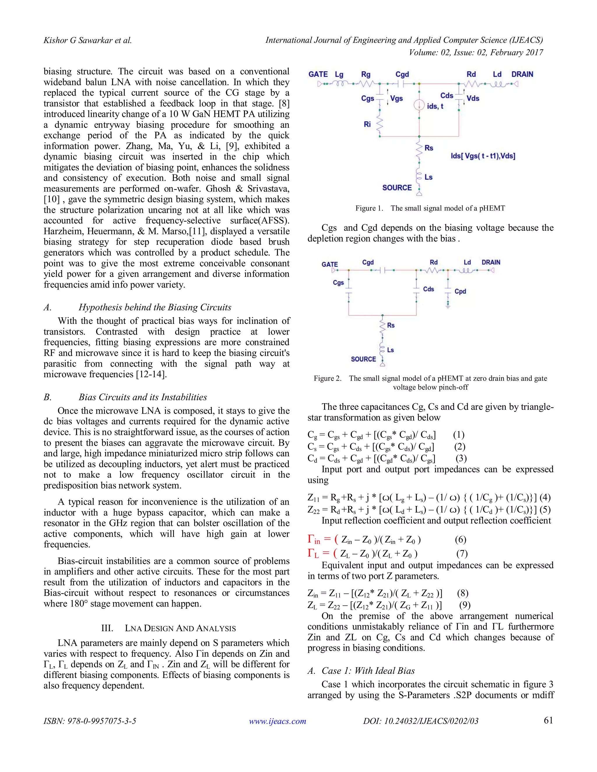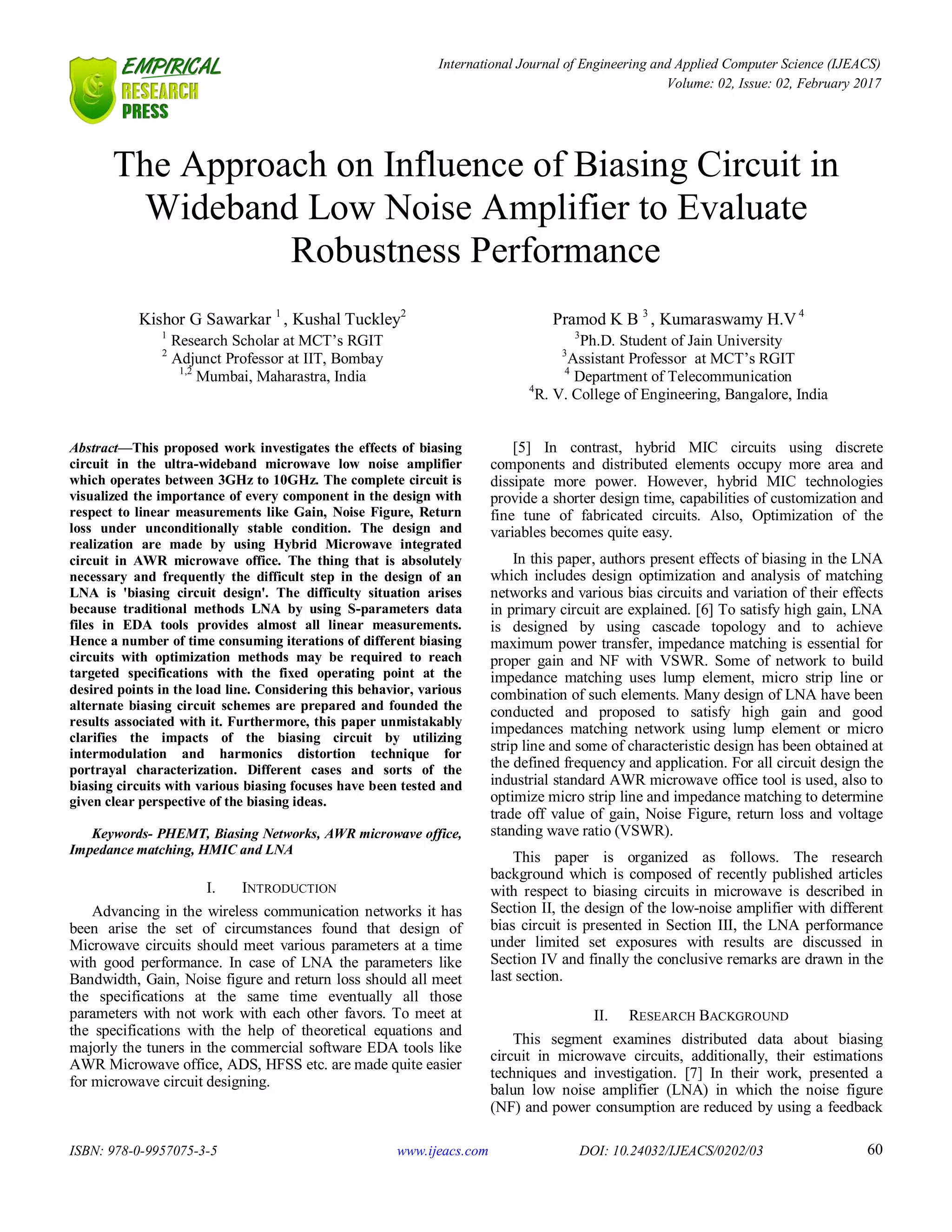The document discusses the influence of biasing circuits on the performance of ultra-wideband low noise amplifiers (LNAs) operating between 3 GHz to 10 GHz. It emphasizes the challenges of biasing design, including optimization methods and various bias circuit configurations, and presents simulation results that showcase the impact of different biasing approaches on key performance parameters such as gain, noise figure, and return loss. The paper also details several cases with different biasing schemes and their outcomes to inform design practices in microwave applications.