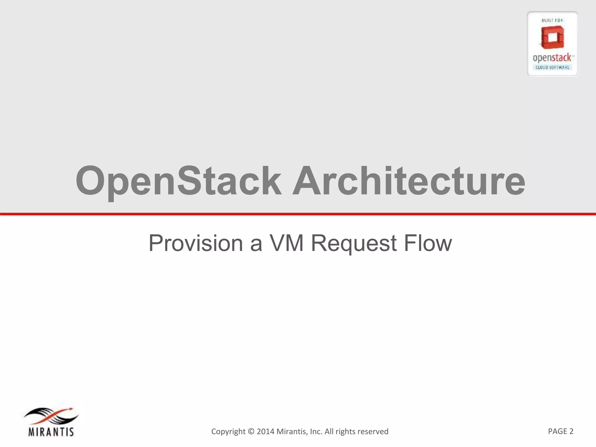 The document provides a detailed overview of the OpenStack architecture and the VM provisioning request flow. It explains the complex interaction between various OpenStack components such as Nova, Keystone, Neutron, and Horizon, outlining each step from initiating a VM provisioning request to processing and validating it. Key components like identity management, scheduler functionality, and service catalog are also described, emphasizing the critical role of the Nova API and message queues in the provisioning process.
