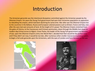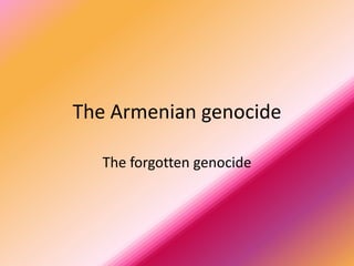 The Armenian genocide was a systematic killing of 1.5 million Armenians by the Ottoman Empire from 1915-1923. The Young Turk government saw the Armenian population as a threat and used World War I as cover to begin mass deportations and killings. Men were killed, women and children were raped and murdered during forced marches. After the war, the new nation of Turkey refused to acknowledge the genocide and still denies it occurred despite photographic evidence. Recognizing this genocide is important to prevent future atrocities.