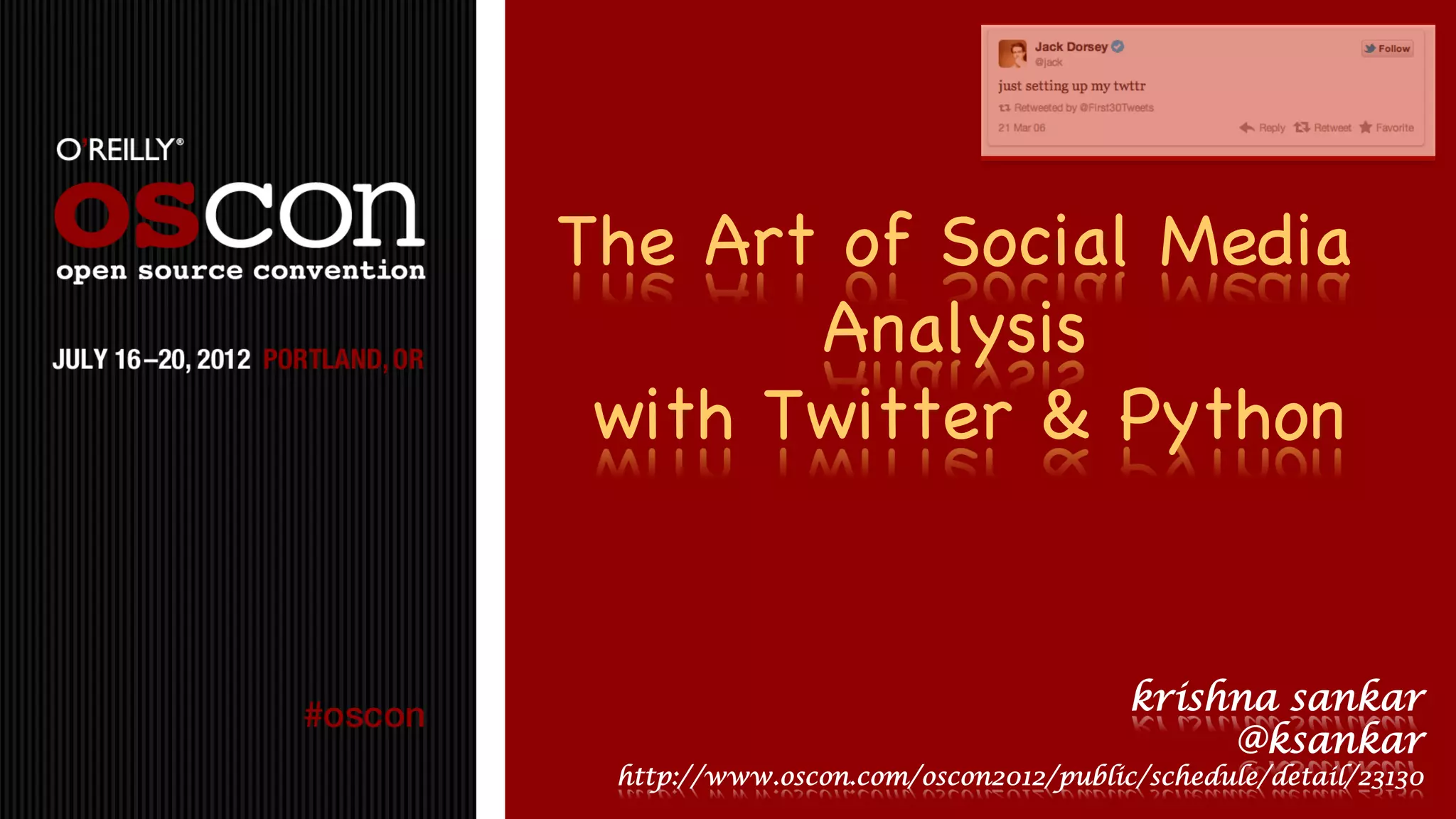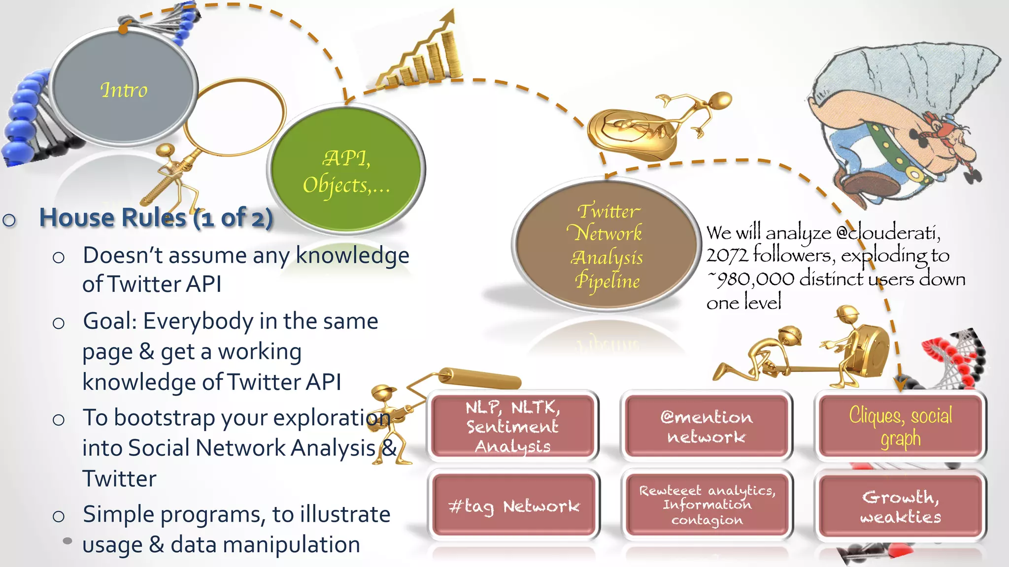 The document discusses analyzing social networks and Twitter data using Python. It provides an introduction to analyzing the Twitter network of the user @clouderati, including 2072 followers. The presentation will cover topics like mentions, hashtags, retweets, and constructing a social graph to analyze cliques and networks. It also provides some tips for working with Twitter APIs and building scalable social media analysis pipelines in Python.