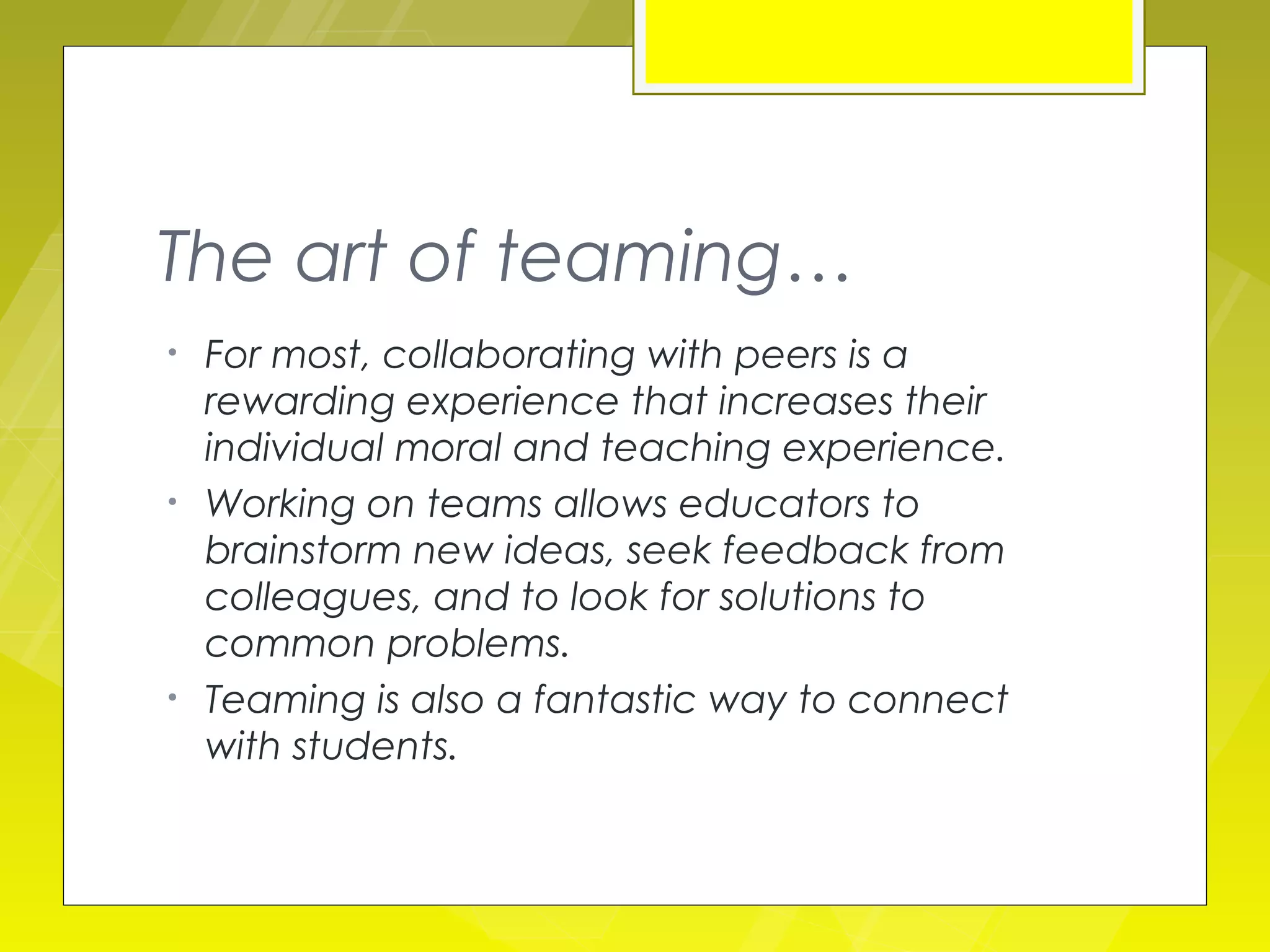 The document discusses the benefits and challenges of teaming among educators. Some key benefits mentioned are collaborating with peers, seeking feedback, and connecting with students as a team. Challenges include the daily effort required to have an effective team as teams must handle issues like attendance, assessments, and parent communication. The document provides advice on how to build a strong team through open communication, sharing workload, and establishing group values and expectations.
