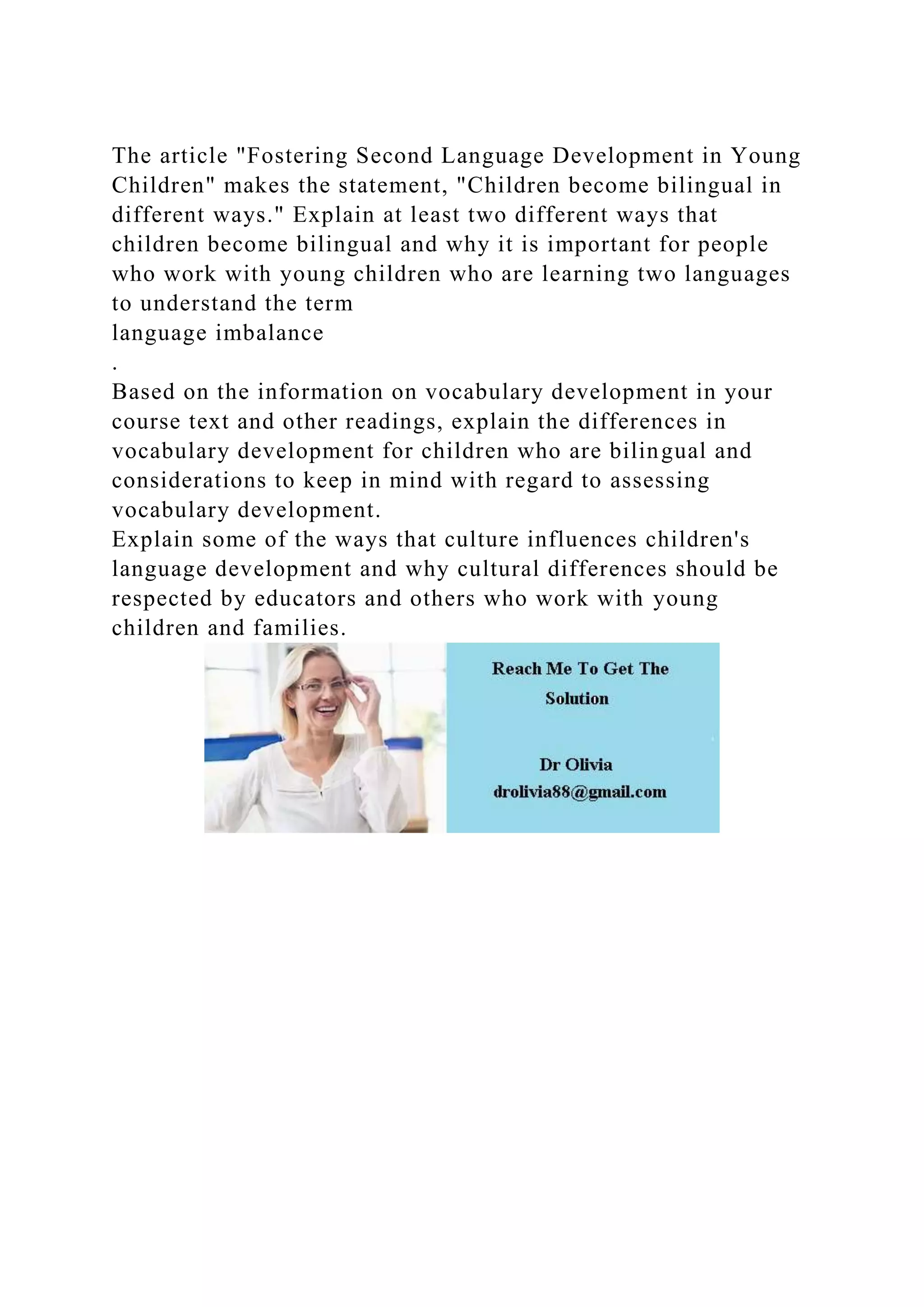 The article discusses that children become bilingual through various means and emphasizes the importance of recognizing language imbalance in early language education. It explores the distinct vocabulary development patterns in bilingual children and highlights the cultural influences on language abilities, underscoring the need for educators to respect and consider these cultural differences when working with young children and their families.