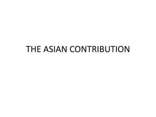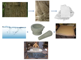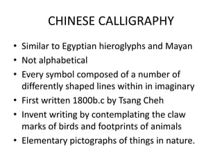 Chinese calligraphy originated around 1800 BC with the earliest forms being pictographs found on oracle bones. Calligraphy evolved through the bronze script era where inscriptions were made on cast bronze objects from 1100 BC. Paper was invented in AD 105 by Cai Lun, allowing writing to be done on a portable surface rather than bamboo strips. Chinese calligraphy is distinguished by its emphasis on the structure, stroke, and precise control of the brush which has been refined over 2000 years of practice in regular script styles. Seals known as "chops" were also developed for leaving personalized stamped impressions.