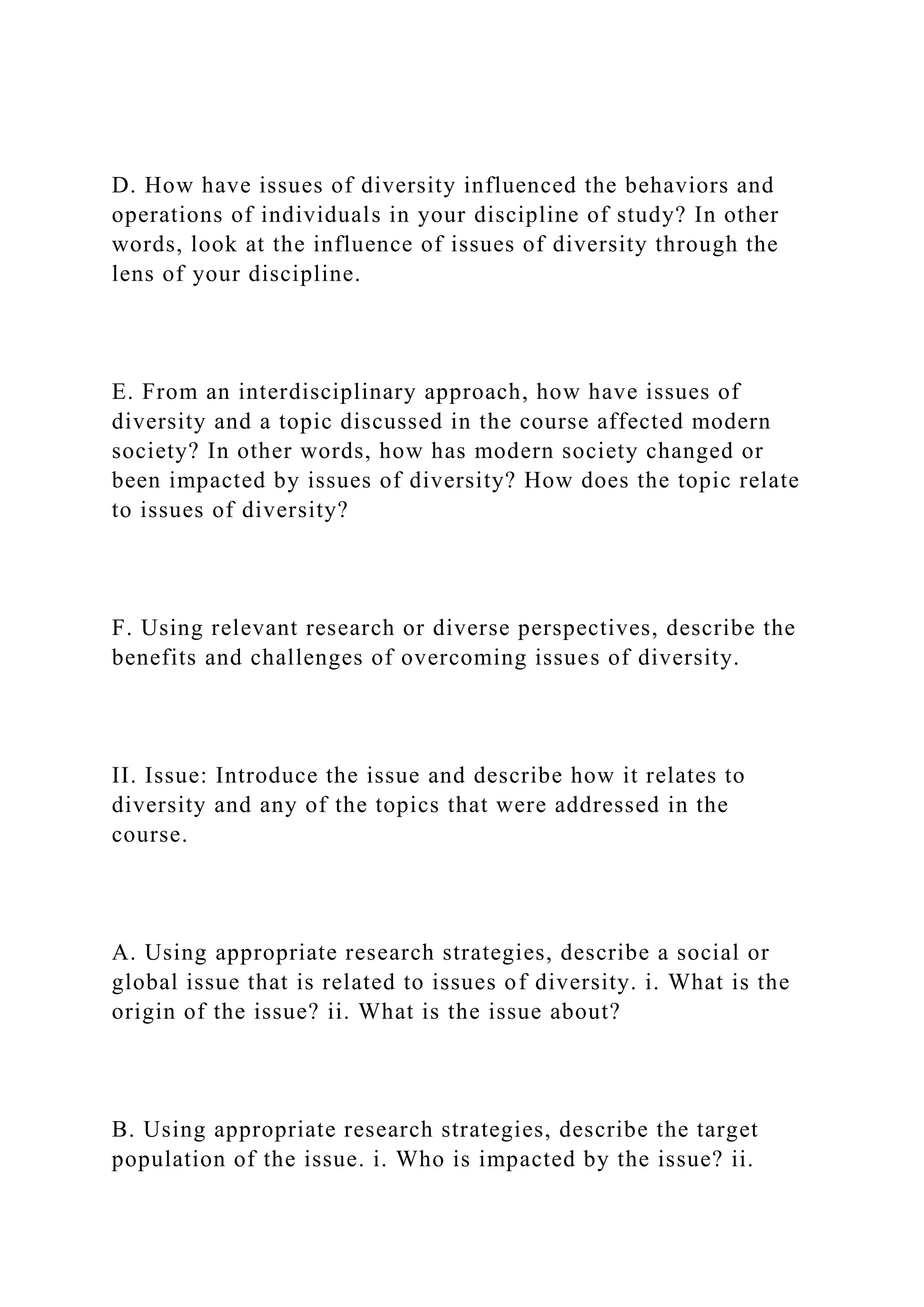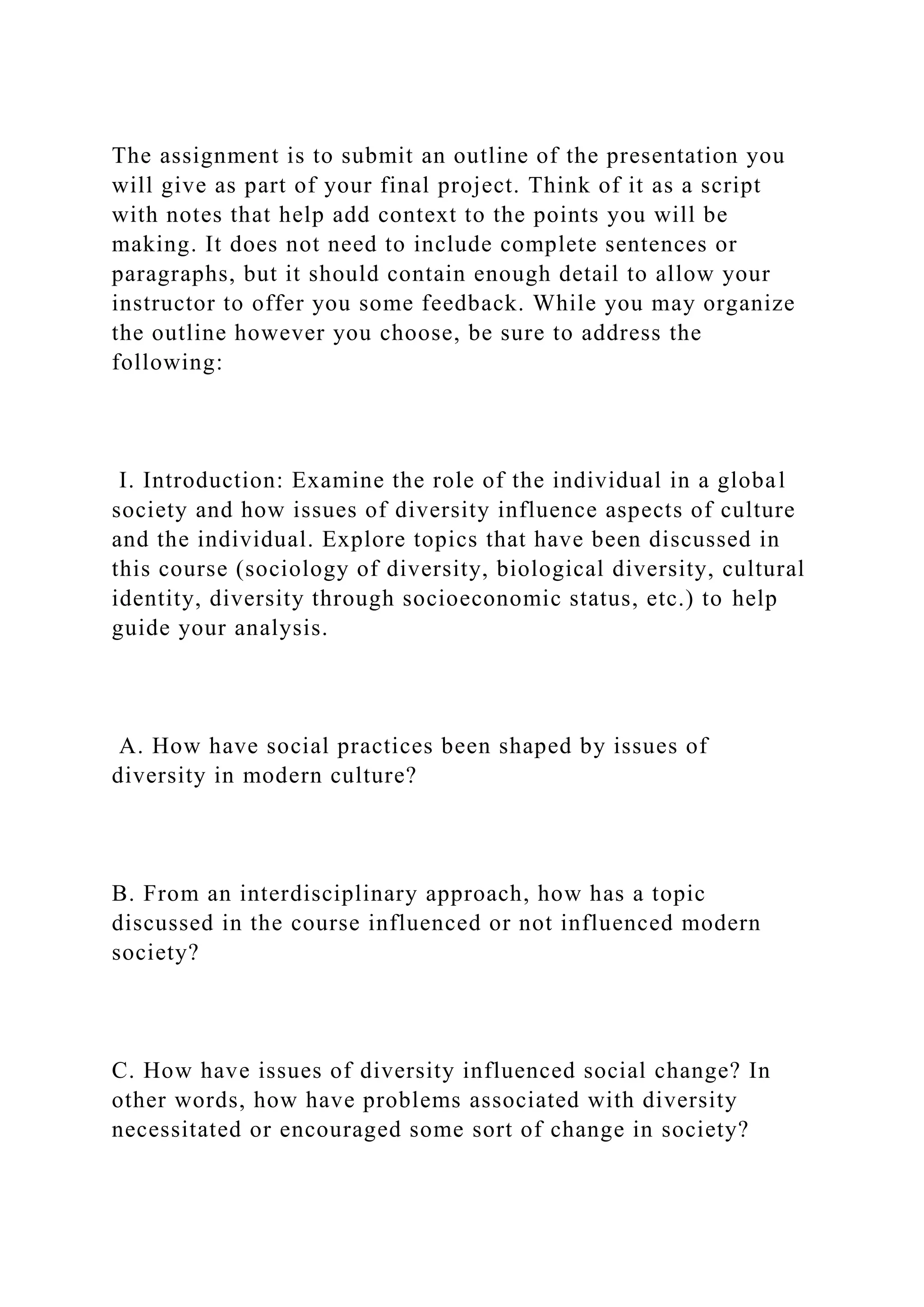 The assignment requires the submission of an outline for a final presentation addressing the role of the individual in a global society concerning diversity and related cultural issues. Topics include the influence of diversity on social practices, the impact of specific issues on modern society, and interdisciplinary approaches to problem-solving. Submissions should be formatted according to specified guidelines and include research-based recommendations for addressing the identified issue.