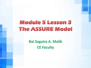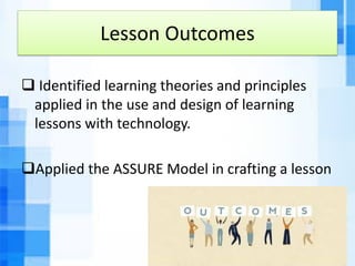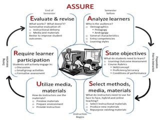 The document discusses the ASSURE model, a systematic approach for crafting instructional lessons that integrate technology. It outlines the 6 steps of the ASSURE model: 1) Analyze learners, 2) State objectives, 3) Select methods/media/materials, 4) Utilize methods/media/materials, 5) Require learner participation, and 6) Evaluate performance. It also provides tips for developing digital stories, including brainstorming concepts, creating storyboards, collecting materials, editing using software, and considering script elements like point of view and pacing.