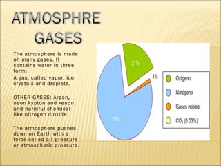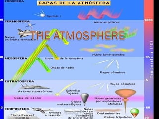 The document summarizes key aspects of the atmosphere and weather. It describes the main layers of the atmosphere, including the troposphere where weather occurs. It also explains that the atmosphere contains gases like nitrogen, oxygen, and water vapor. Greenhouse gases like carbon dioxide and methane trap heat in the atmosphere and contribute to the greenhouse effect. The document outlines factors that influence weather and issues like global warming from rising greenhouse gas levels.