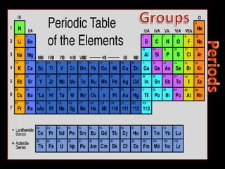 The document defines key atomic terms like atom, nucleus, protons, neutrons, and electrons. It describes how atoms are made up of a tiny nucleus surrounded by an electron cloud. Atoms of the same element have the same number of protons. The number of neutrons and electrons can vary. The periodic table arranges elements in periods and groups based on their atomic structure and number of valence electrons.