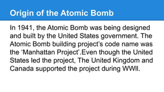 The atomic bomb was developed by the United States during World War II under the Manhattan Project, with significant support from the UK and Canada. It was designed to halt Nazi Germany's uranium-235 purification efforts, eventually leading to the bombings of Hiroshima and Nagasaki in August 1945, resulting in significant casualties. Additionally, a propaganda campaign was initiated, including the distribution of leaflets and newspapers to inform and influence the Japanese populace.