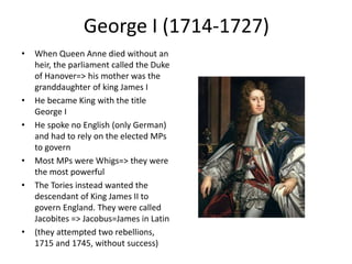 George I became king of England in 1714 when Queen Anne died without an heir. As he spoke only German, he relied on elected members of parliament (MPs) from the Whig party to govern. George II's reign saw Sir Horace Walpole become the first prime minister and remain in power for over 20 years. George III's reign was marked by military conflicts including the American War of Independence and the French Revolution. He later suffered from mental illness. During the Augustan age, political and intellectual leaders saw England as the heir to Rome and its stable government and growing empire. Coffee houses flourished as intellectual centers for debate.
