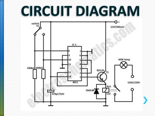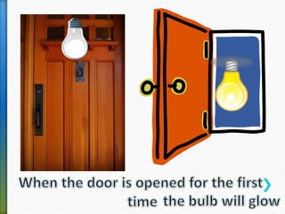 The document describes the working principle of an automatic door light switch. The switch uses bistables inside a CMOS 4013 chip connected in series to store the state of the switch. When the door is opened, flip-flop 2 registers and turns on the light. When the door is closed, the light remains on. Opening the door a second time causes flip-flop 1 to change state, turning off the transistor and relay to switch off the light. The relay is designed to operate between 5 and 15 volts.