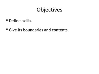 The axilla is a pyramid-shaped space bounded by the upper arm, chest wall, and scapula. It contains neurovascular structures passing from the neck to the upper limb, including the brachial plexus, axillary artery and vein, and lymph nodes. The walls of the axilla are formed by specific muscles like pectoralis major anteriorly and subscapularis posteriorly. The axilla allows for movement of the arm and transmission of major blood vessels and nerves.