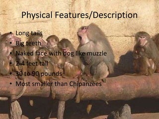Baboons are medium-sized monkeys found in Africa. They have long tails, big teeth, and naked faces. Baboons live in troops of up to 300 individuals in savannas, scrubs, bushes, farmland, and mountains. They are active during the day and spend most of their time on the ground. Baboons eat plants like roots, grasses, bark and twigs, as well as small animals. They can jump far and are known to attack moving vehicles.