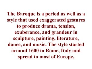 The Baroque period and style began in 1600 in Rome and spread across Europe, known for exaggerated gestures and drama in sculpture, painting, literature, dance and music. Baroque architecture is characterized by grand buildings like the Palace of Versailles. Baroque painting used dynamic movement and emotion in works by artists like Rubens. Baroque music featured mood-driven works, complex melodies, basso continuo accompaniment, terraced dynamics and polyphonic textures.
