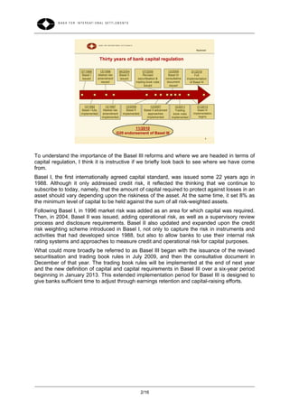 The document summarizes key aspects of the Basel III capital framework agreement. It highlights 9 breakthroughs in Basel III, including a focus on tangible equity capital rather than complex capital instruments, reduced reliance on banks' internal models, and greater emphasis on stress testing to increase bank safety. It discusses both the microprudential, firm-specific approach to capital requirements as well as the new macroprudential, systemic risk-based elements introduced in Basel III.