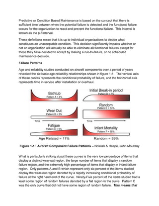 The document discusses the concept of failures in maintenance organizations, emphasizing the need for a clear definition of failure to effectively eliminate them. It categorizes failures into functional and potential types, outlines different failure patterns, and examines their causes at various stages of an equipment's life cycle. Additionally, it highlights the role of a failure reporting, analysis, and corrective action system (FRACAS) in identifying and addressing chronic failures to enhance overall business performance.