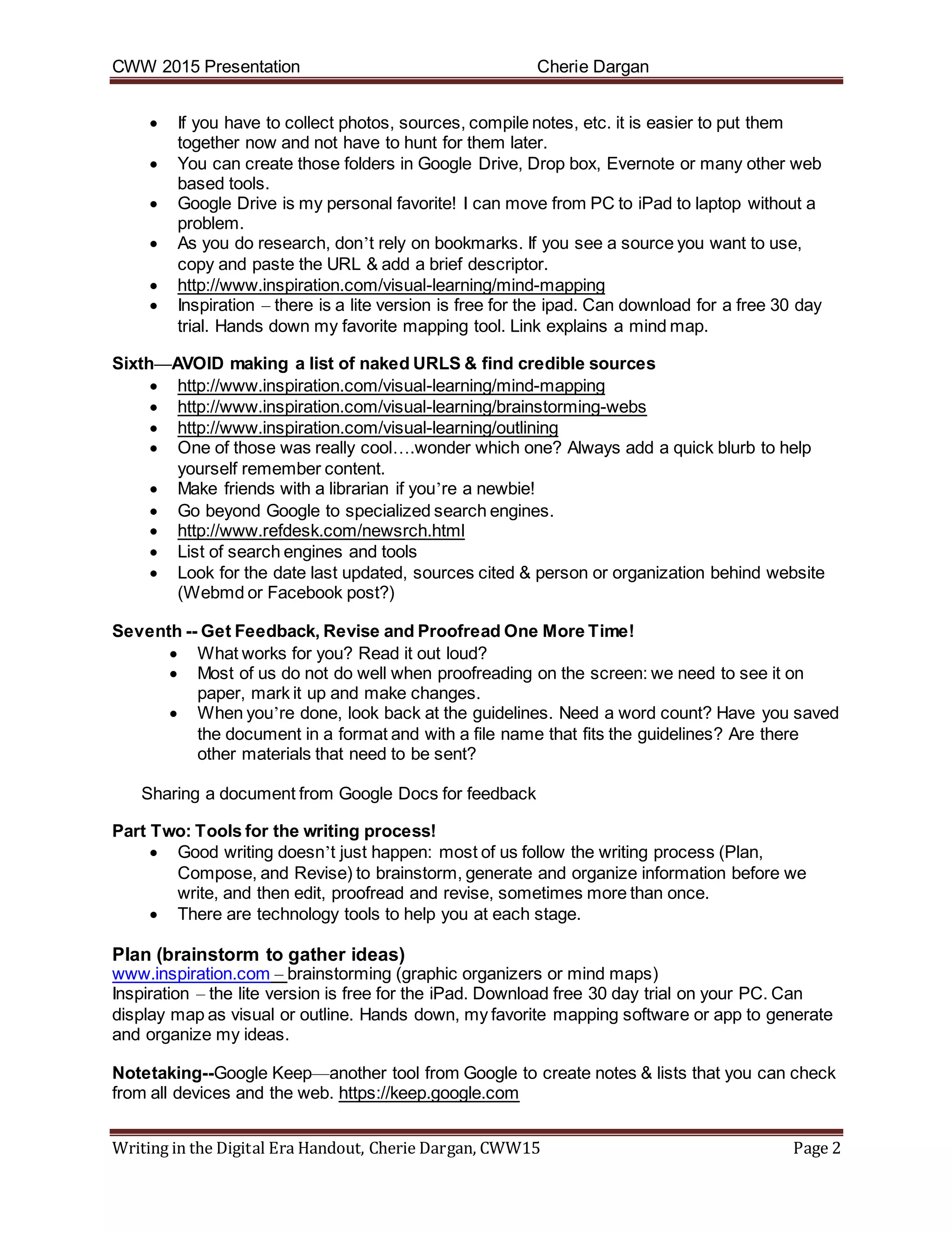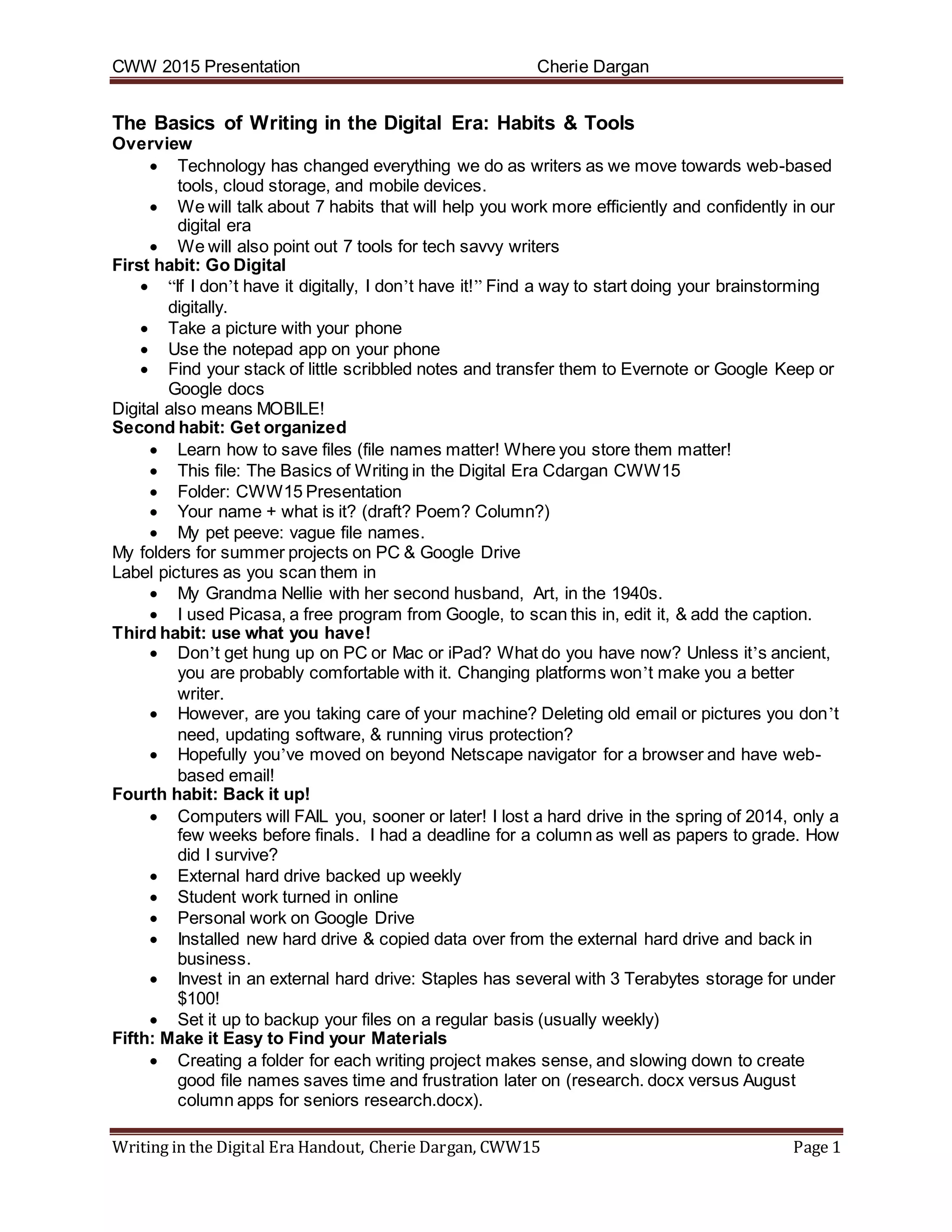 The document discusses habits and tools for writing in the digital era. It recommends 7 habits: going digital, getting organized, using existing technology, backing up files, making materials easy to find, avoiding naked URLs, and getting feedback. It also outlines 7 tools for each stage of writing: planning with Inspiration, researching with RefDesk, composing with Scrivener, editing with Hemingway App, getting feedback via Google Docs, managing submissions with WritersDB, and notes taking with Google Keep. The document provides tips and links for digital organization, backups, finding sources, and using technology throughout the writing process.