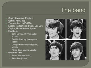 The Beatles were a highly influential rock band formed in Liverpool, England in 1960. Originally consisting of John Lennon, Paul McCartney, George Harrison, Stuart Sutcliffe and Pete Best, they became one of the most commercially successful and critically acclaimed acts in the history of popular music. Between 1963-1970, they released 12 studio albums including Sgt. Pepper's Lonely Hearts Club Band and Abbey Road, and had many hit singles such as "Hey Jude" and "Come Together." Following their breakup in 1970, they pursued solo careers but remain one of the best-selling artists of all time.