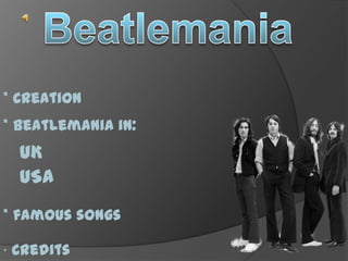The document discusses the creation and popularity of The Beatles, noting their rise to fame in the UK and US in the 1960s through famous songs and concerts that sparked intense fan frenzy known as "Beatlemania". It also lists some of The Beatles' most famous songs from albums like "Please Please Me" and "Rubber Soul" that helped make them one of the best-selling bands of all time.