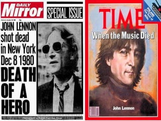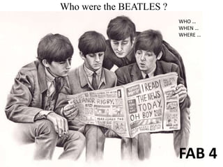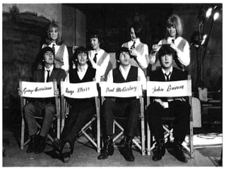 The document provides an overview of The Beatles, a prominent band consisting of John Lennon, Paul McCartney, George Harrison, and Ringo Starr. It details their formation, peak years, notable songs, filmography, and the events leading to their split and Lennon's death. The content reflects on their cultural impact and key milestones between 1958 and 1970.