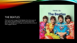 The Beatles formed in 1960 in Liverpool, England and consisted of Paul McCartney, John Lennon, George Harrison, and Ringo Starr. They were one of the most influential rock bands ever, creating over 53 albums and 237 songs that incorporated many different musical styles. Some of their most famous albums include Sgt. Pepper's Lonely Hearts Club Band and Abbey Road, and songs like "Hey Jude" and "Come Together." The Beatles had a huge impact on rock music and popularized it globally before separating in 1970.