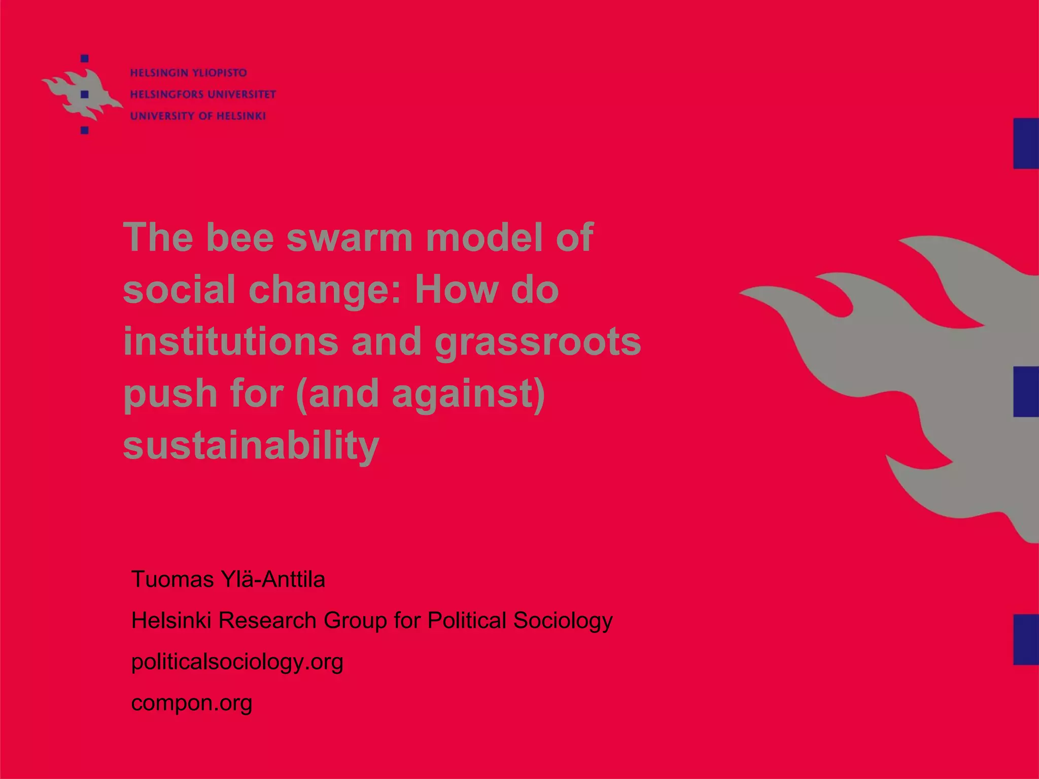 The document discusses the bee swarm model of social change, highlighting how institutions and grassroots movements influence sustainability. It presents findings from research on climate change advocacy coalitions in 12 countries, noting the stronger presence of economy coalitions compared to ecology ones, particularly in Finland. The conclusion emphasizes that successful sustainability initiatives require building support around pragmatic instruments rather than solely focusing on core beliefs.