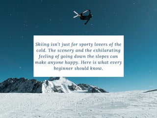 This document is a beginner's guide to skiing, outlining essential information about gear, suitable resorts, lessons, and physical fitness. It emphasizes borrowing gear initially, selecting beginner-friendly resorts, and the importance of professional lessons over casual advice. Additionally, it suggests fitness preparation and alternative activities at ski resorts for those who may not enjoy skiing.