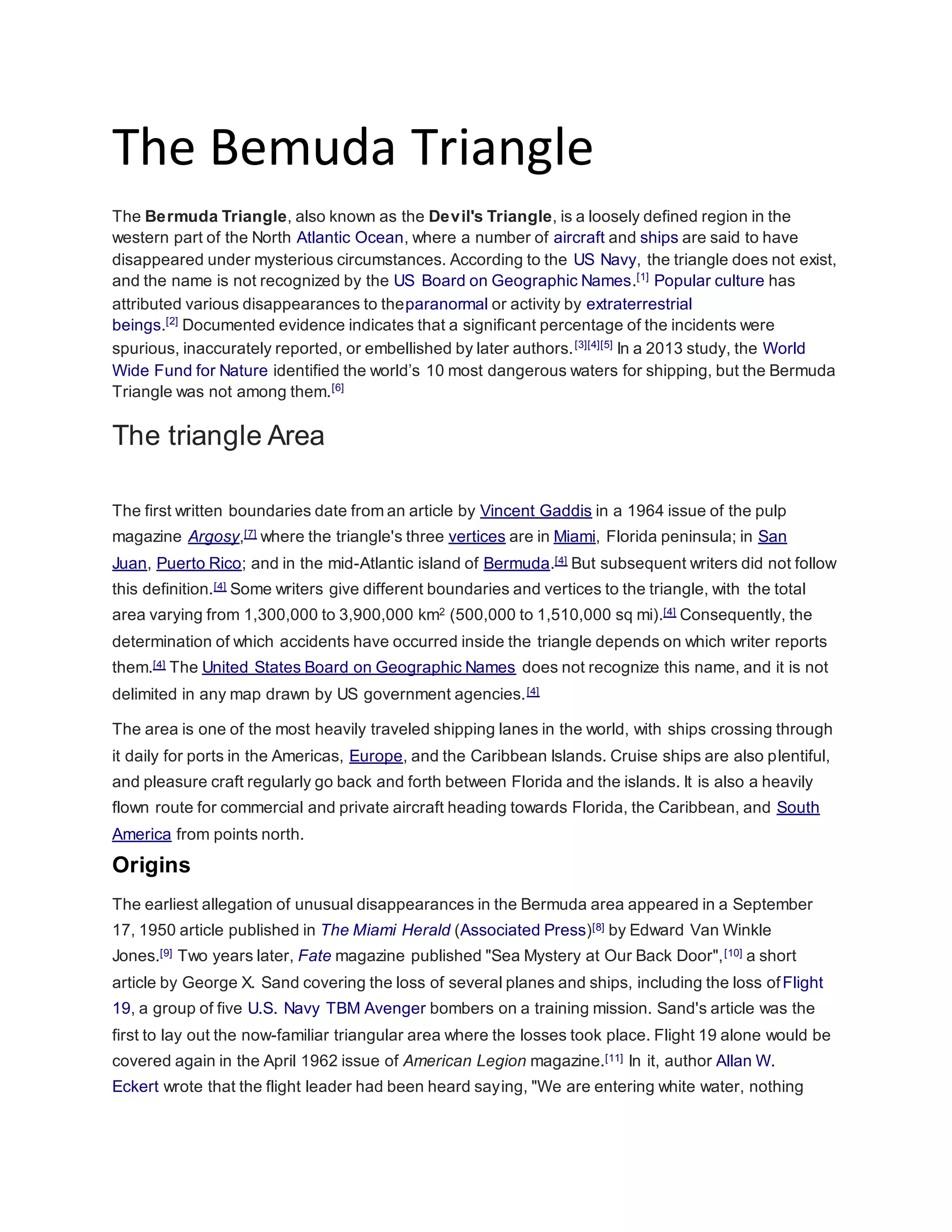 The Bermuda Triangle is an area in the western part of the North Atlantic Ocean where a number of aircraft and ships are said to have disappeared under mysterious circumstances. Popular culture has attributed these disappearances to paranormal or extraterrestrial activity. However, studies have found that many reported incidents were inaccurately reported or exaggerated. Natural explanations like human error, violent weather, methane gas bubbles sinking ships, and strong ocean currents provide plausible explanations for the majority of incidents in the area.