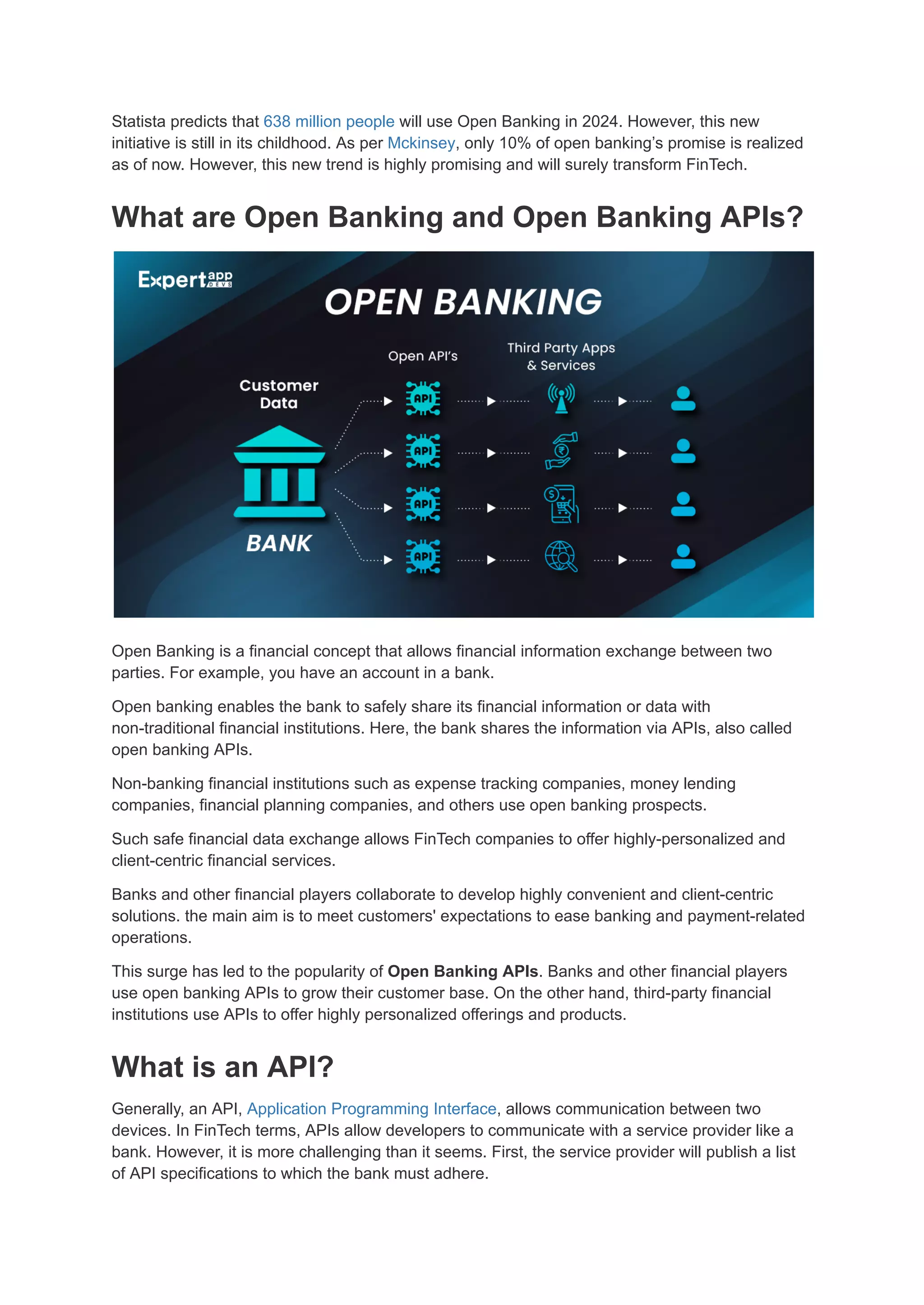 The document discusses the rapid growth of the fintech industry, fueled by customer-focused products and the emergence of open banking APIs. Open banking facilitates the secure exchange of financial information between banks and non-traditional financial institutions, enhancing the personalization of services. Although open banking is still in its infancy with only 10% of its potential realized, it promises to transform fintech by allowing banks to gain valuable customer insights and improve service delivery.