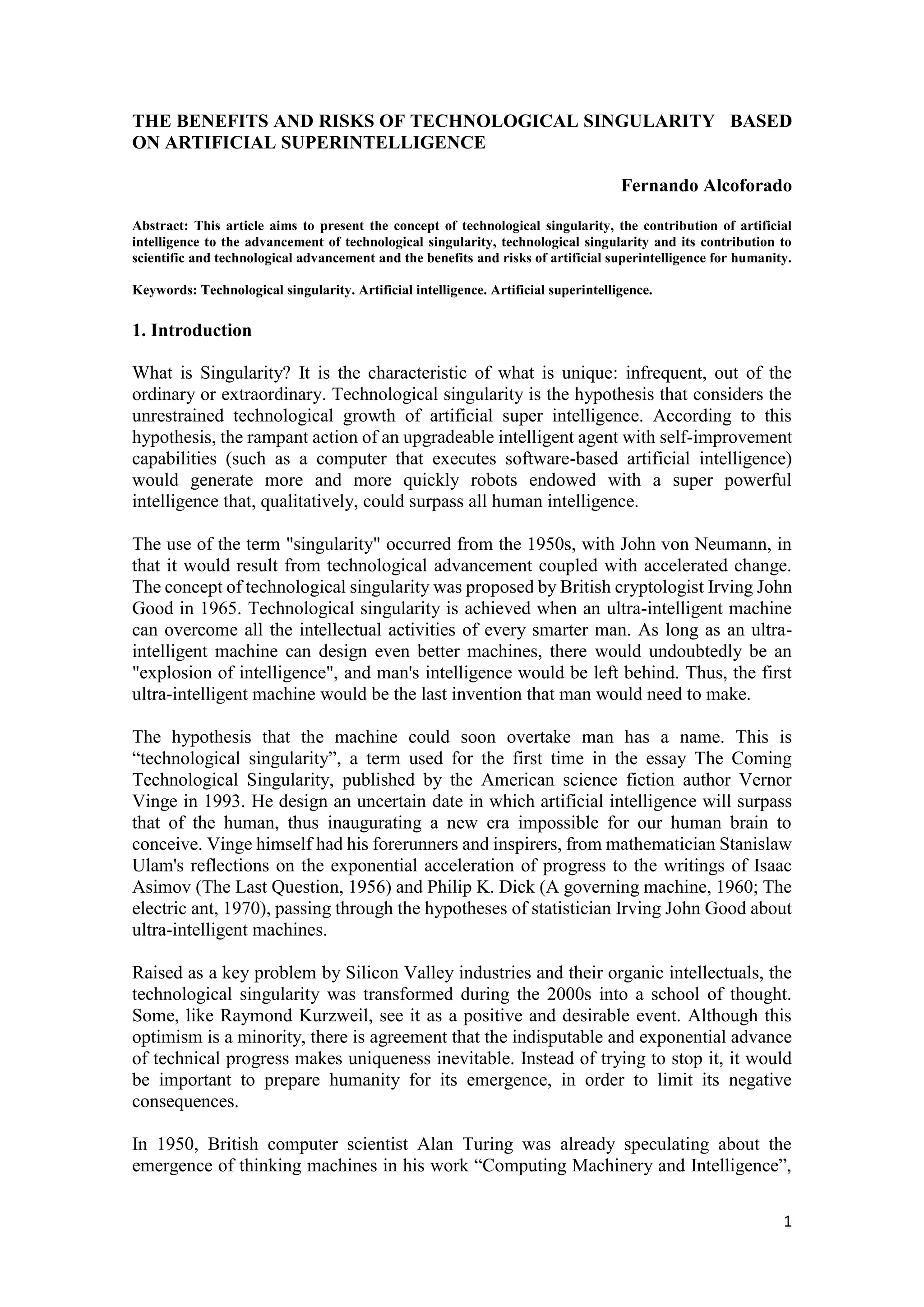 This document discusses the concept of technological singularity, which posits that artificial superintelligence may surpass human intelligence, leading to profound transformations in society and potential existential risks for humanity. It outlines the contributions of artificial intelligence to technological advancements and the dual nature of its impact, offering both beneficial solutions to existential threats and concerns about unemployment and misuse of technology. The document emphasizes the importance of preparing for these changes and ensuring that governance structures support the responsible development of artificial intelligence for the common good.