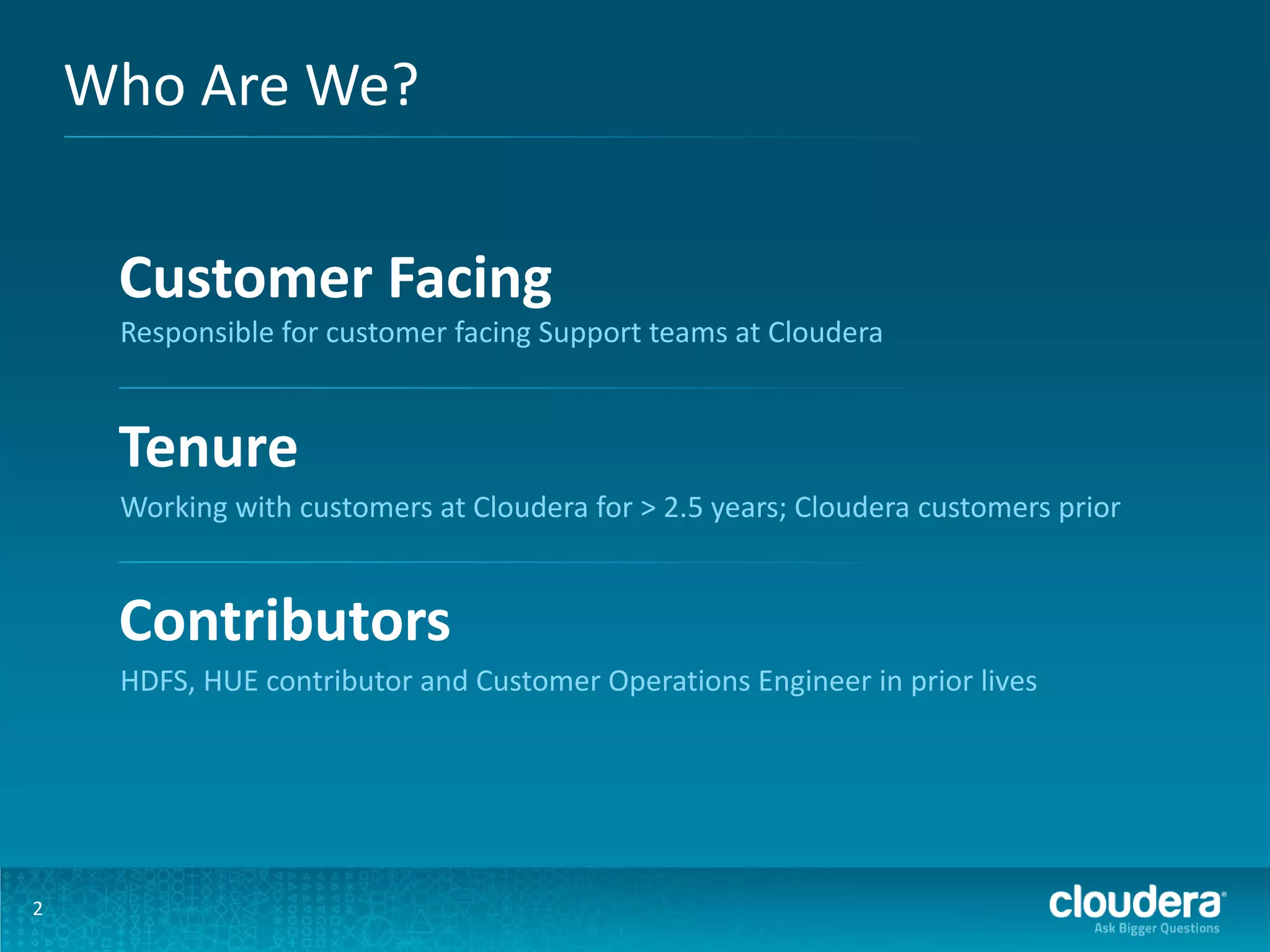 Cloudera's predictive and proactive support provides customers with the broadest global coverage and deepest expertise. A dedicated global support team uses sophisticated analytics across multiple clusters to prevent issues before they occur. The team also provides technical guidance based on performance patterns and proactively monitors customer systems for issues. This predictive approach is complemented by reactive support when issues do occur, addressing incidents rapidly and making configuration recommendations. Customers benefit from fewer disruptions, improved performance, and a voice into Cloudera's roadmap and Apache community projects.